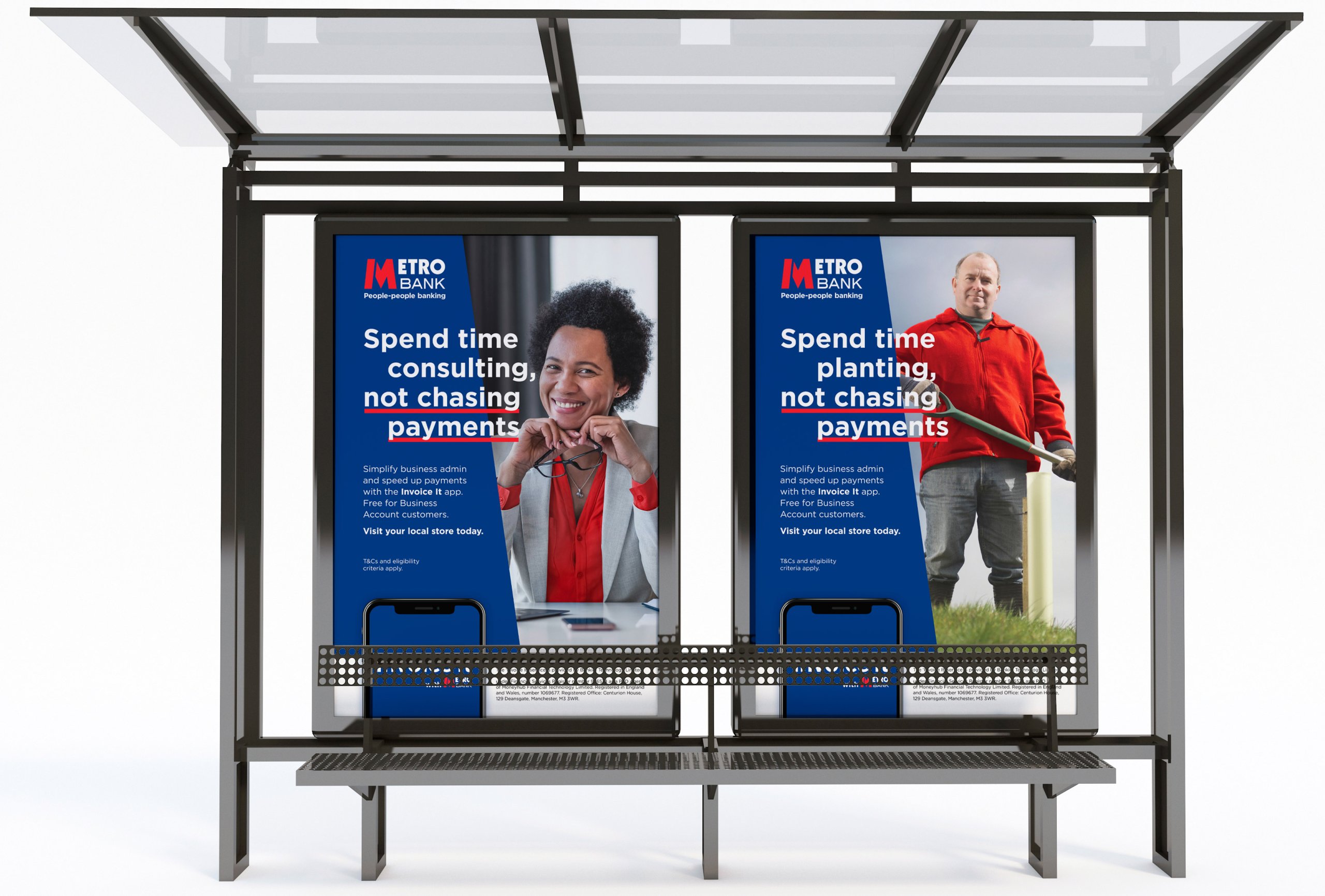 This showcases our marketing work with Metro Bank. We are promoting our advertising services, not the financial products shown.