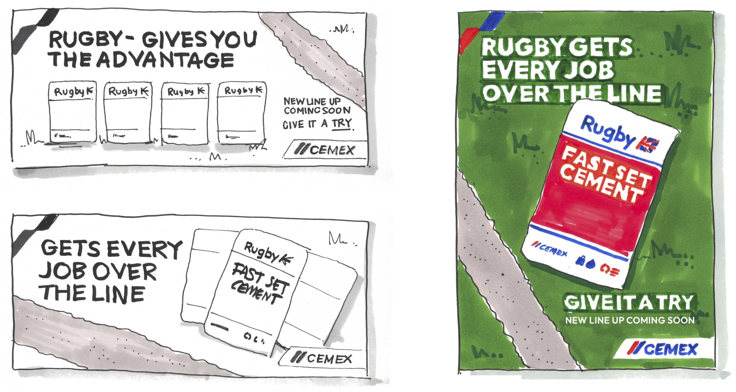 Weaved throughout the campaign, these references add a playful twist to product benefits: Rugby cement ‘Gives you the advantage’ and ‘Gets every job over the line’, for instance, and merchants and builders are invited to ‘Give it a try’.