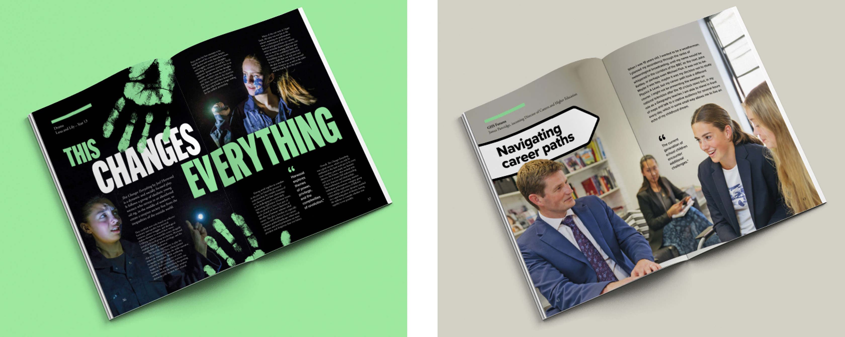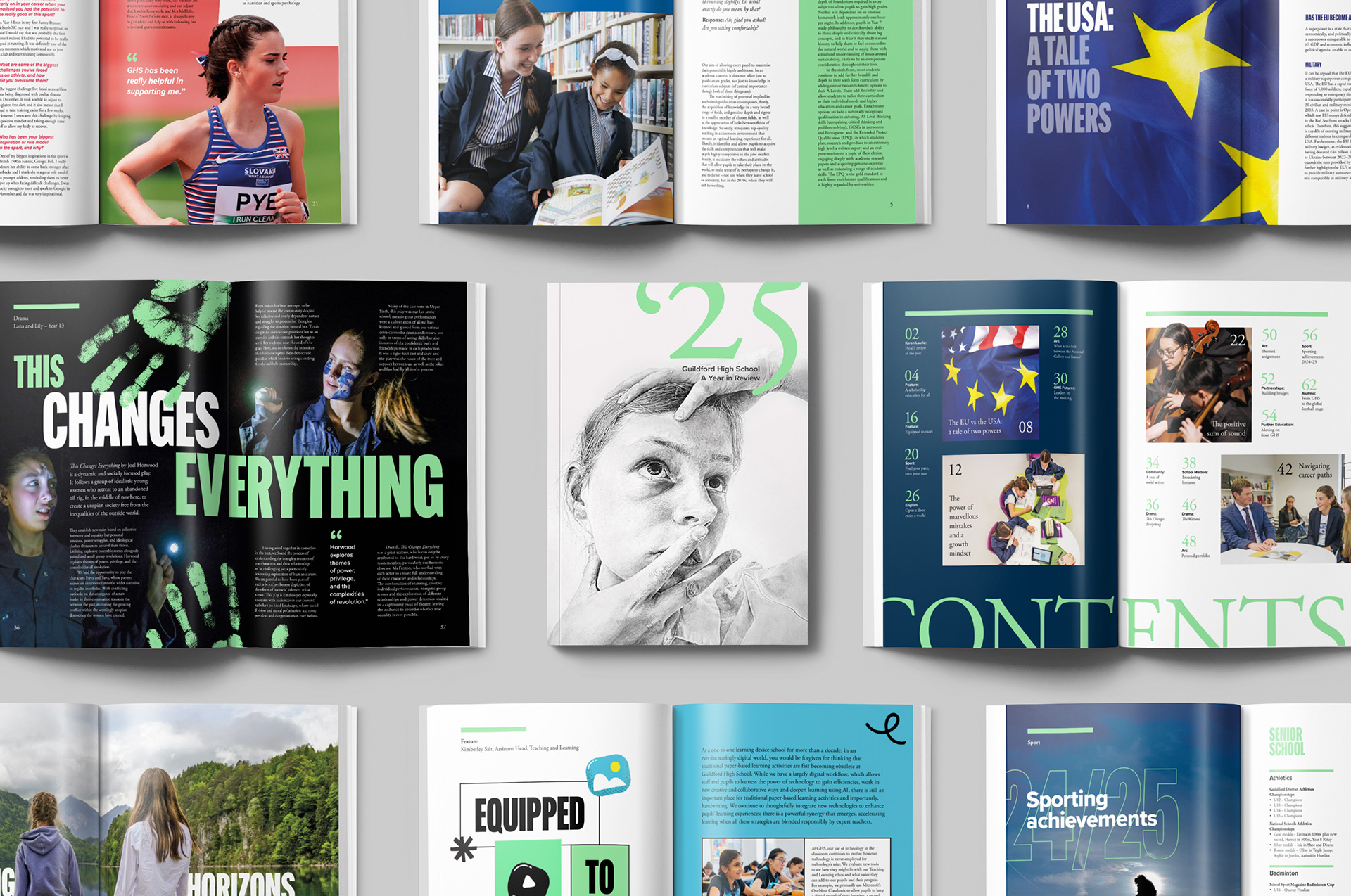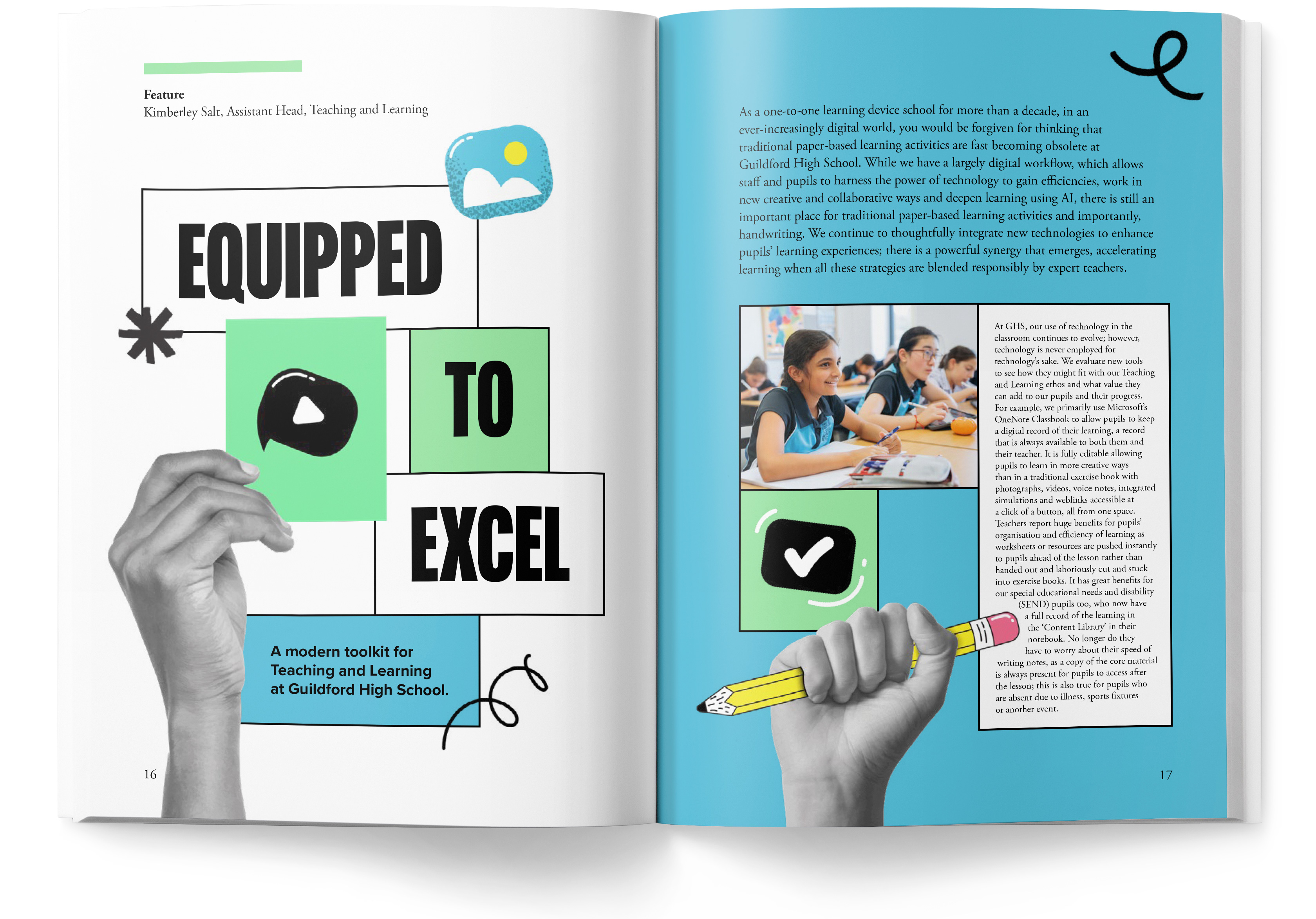 Targeting students, parents/guardians, staff, alumni and prospective families the publication comprises feature articles, alumni success stories and staff highlights. Working closely with the team at Guildford High School, we created a design that brought together photography of the school and students with illustration and stock imagery.