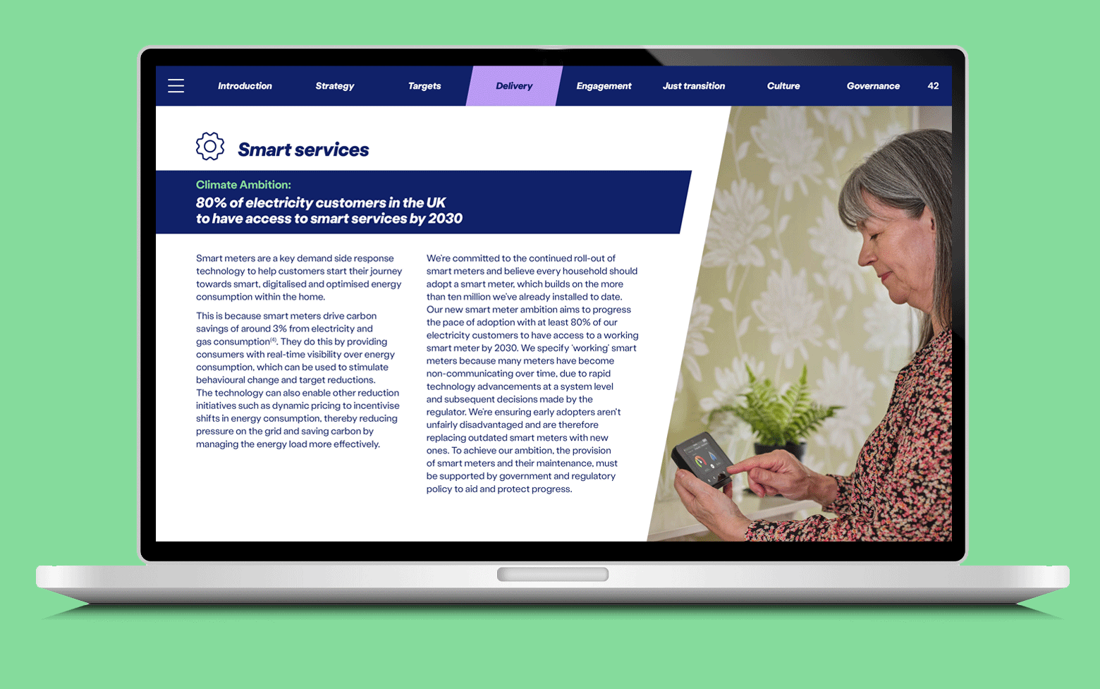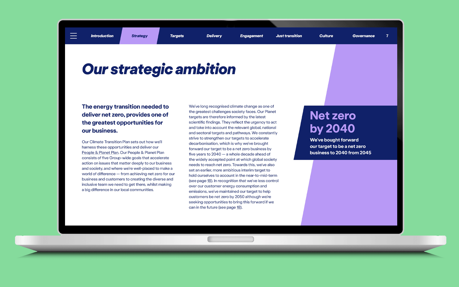 The Plan outlines how they’ll support every customer and their own business to be net zero. With a range of content including graphs, infographics, case studies and testimonials alongside targets and ambitions, our job was to bring everything together in one, cohesive design.