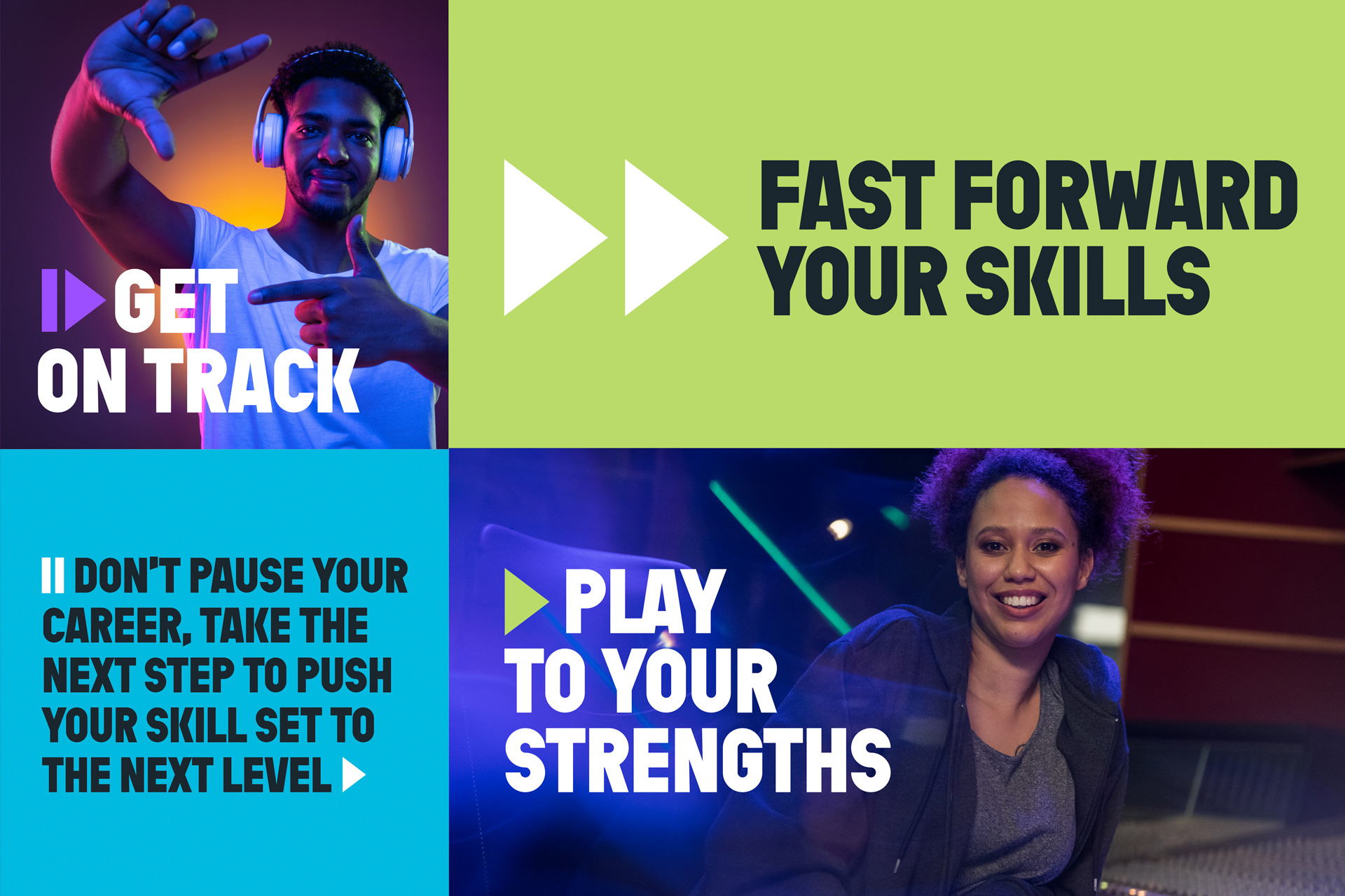Our bold new look and feel boosts the organisation’s credibility and professionalism, while retaining its youthful appeal. Building on the visual shorthand of pause, play and fast-forward buttons, the new brand emphasises how Iconic Steps boosts people’s careers. The accompanying copy reinforces this with lines such as ‘don’t pause your career’, ‘play to your strengths’ and ‘fast-forward your skills’.