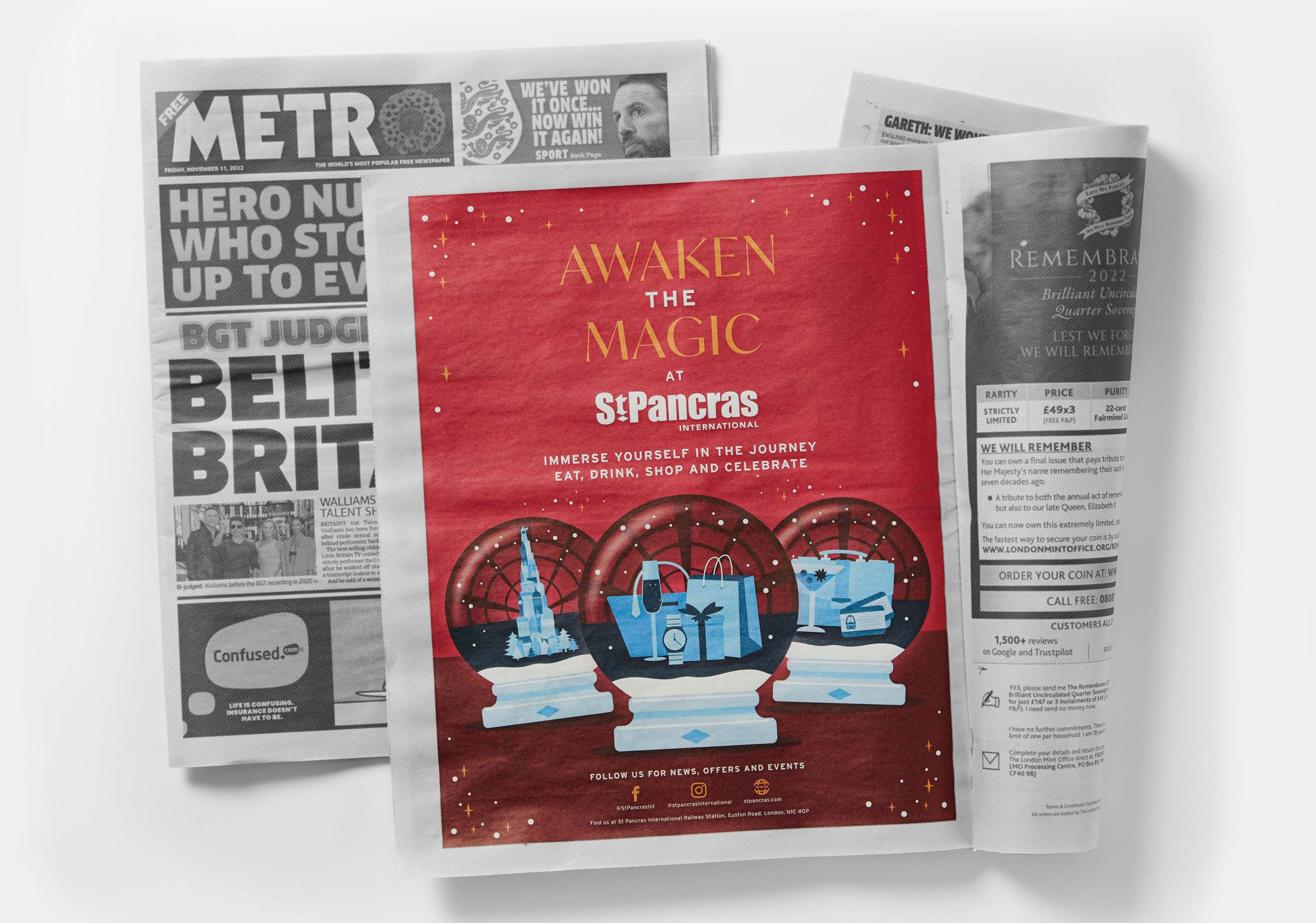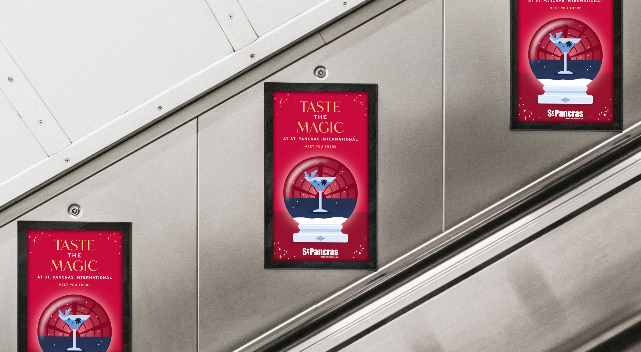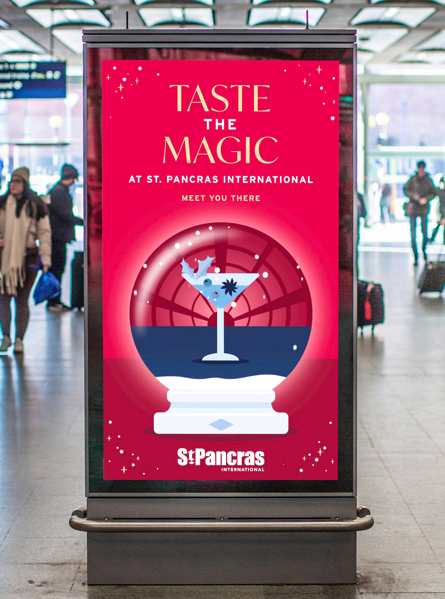 The campaign spans print and digital, including: in-station banners and digital screens; printed press ads; design for social; and digital ads on the Tube. We also created an interactive AR Instagram filter for commuters, shoppers, and diners to ‘shake and share’ whilst soaking up the festive atmosphere at St. Pancras International.