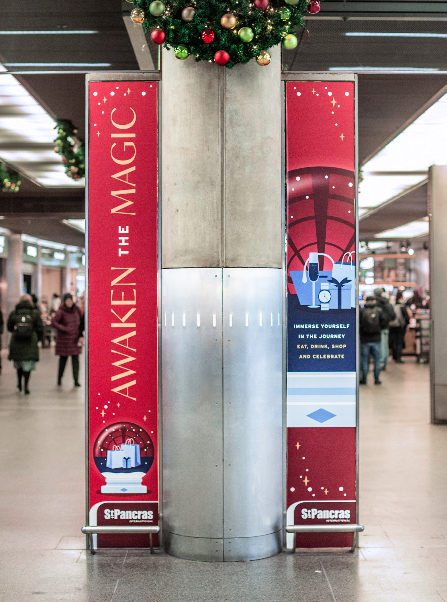 Bespoke illustrations within the snow globes highlight the diverse retail offerings within the station, festive food and drink, music, and the beautiful Christmas tree.