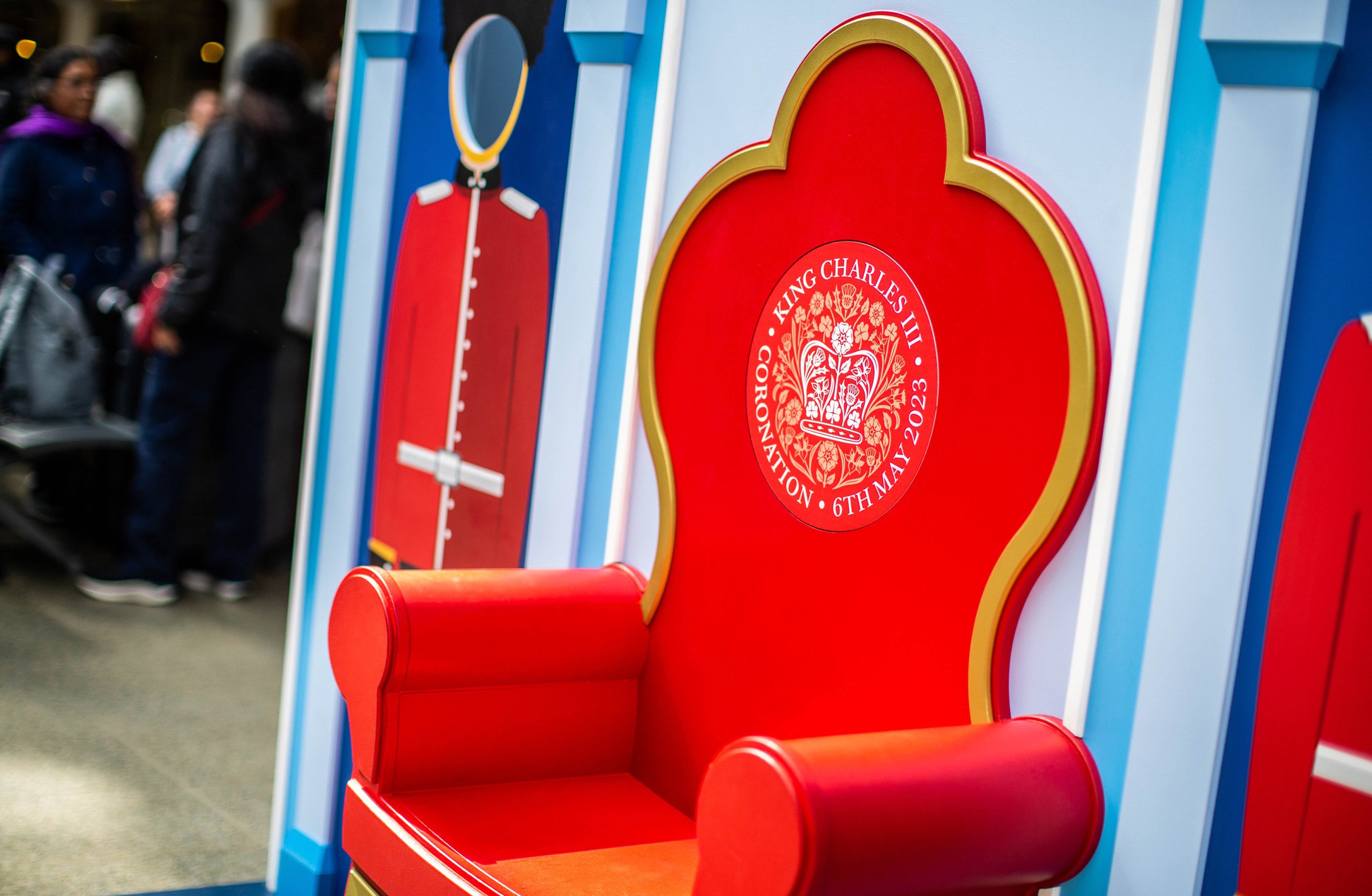 An interactive installation commands attention at the heart of the station concourse: a stylised red throne and Kings’ Guards photo opportunity.