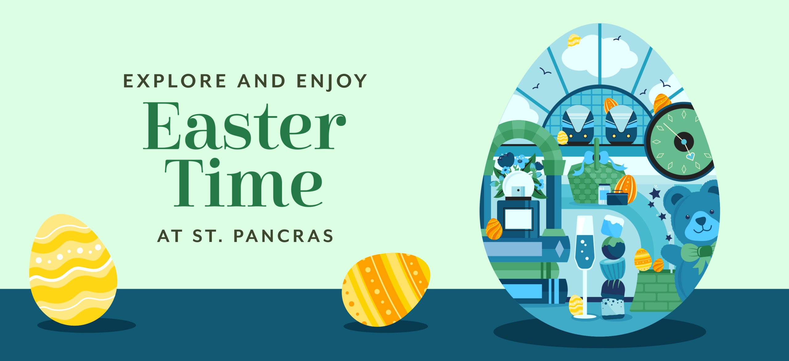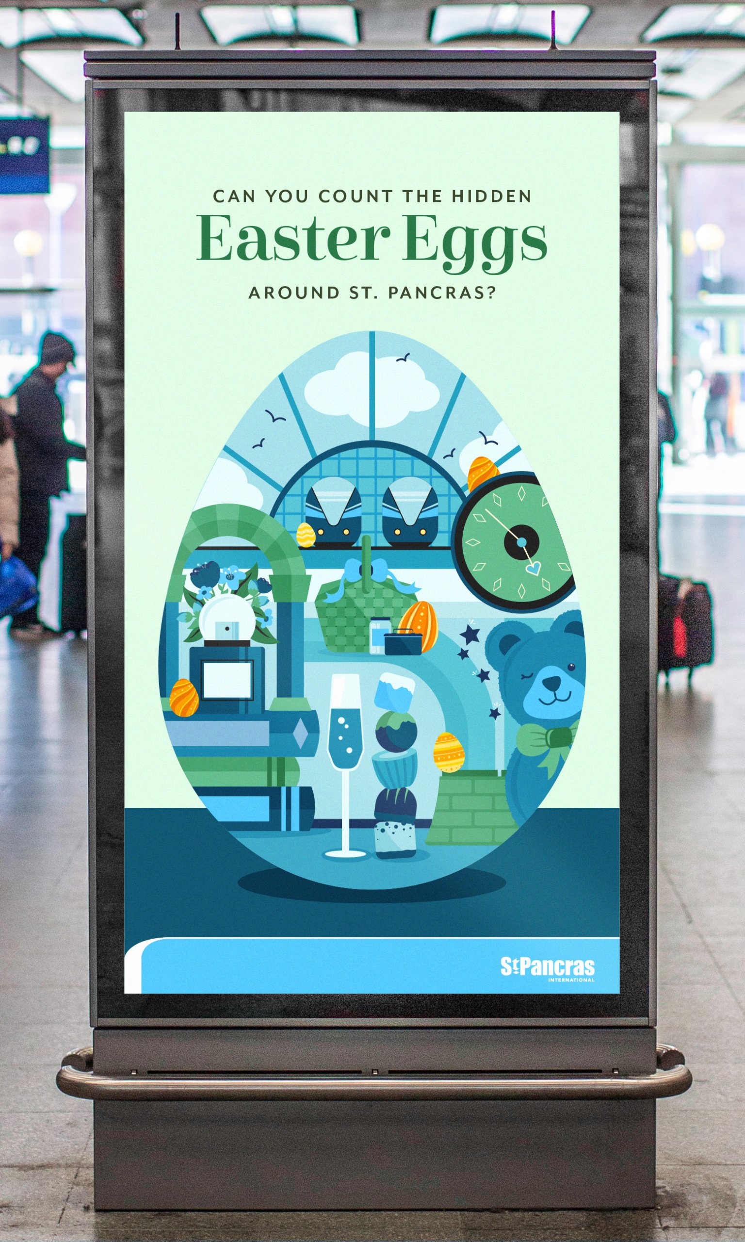 We added a little fun to St. Pancras International this Easter with some bespoke animations, encouraging visitors to explore the station and hunt for hidden Easter eggs. Encapsulated within a St. Pancras themed egg, illustrations highlight key features of the station, beautiful gifts and food and drink offerings.