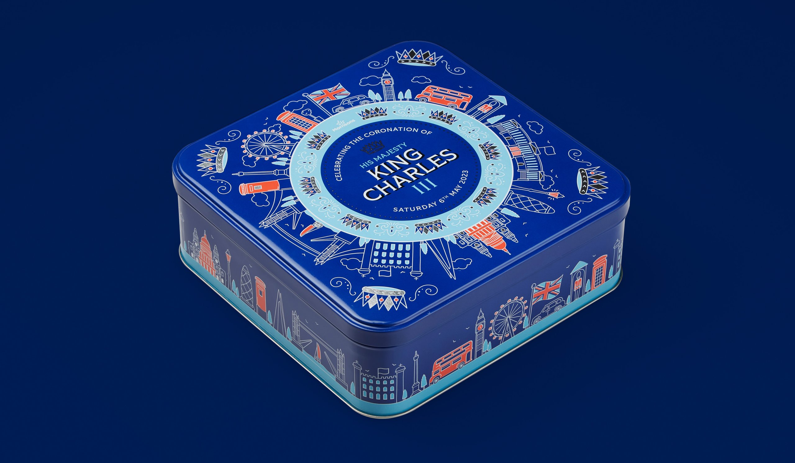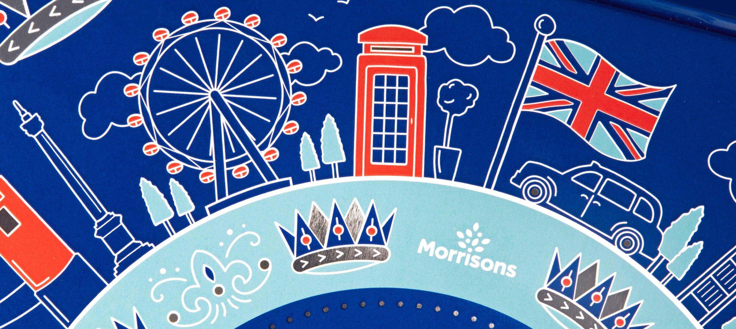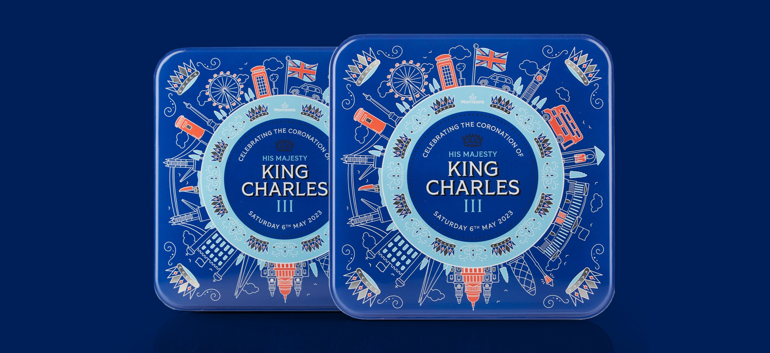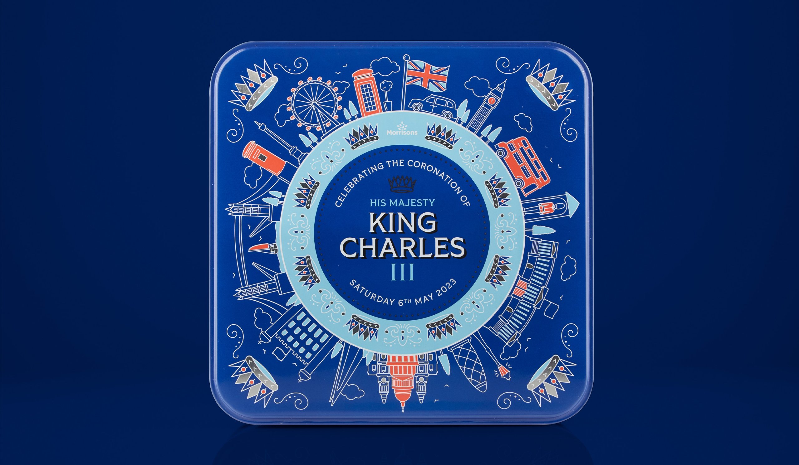 We’ve created a royal biscuit tin with Morrisons to celebrate the Coronation of His Majesty King Charles III. The tin features a continuous skyline of bespoke London landmark illustrations, paired with royal crowns to highlight the special occasion.