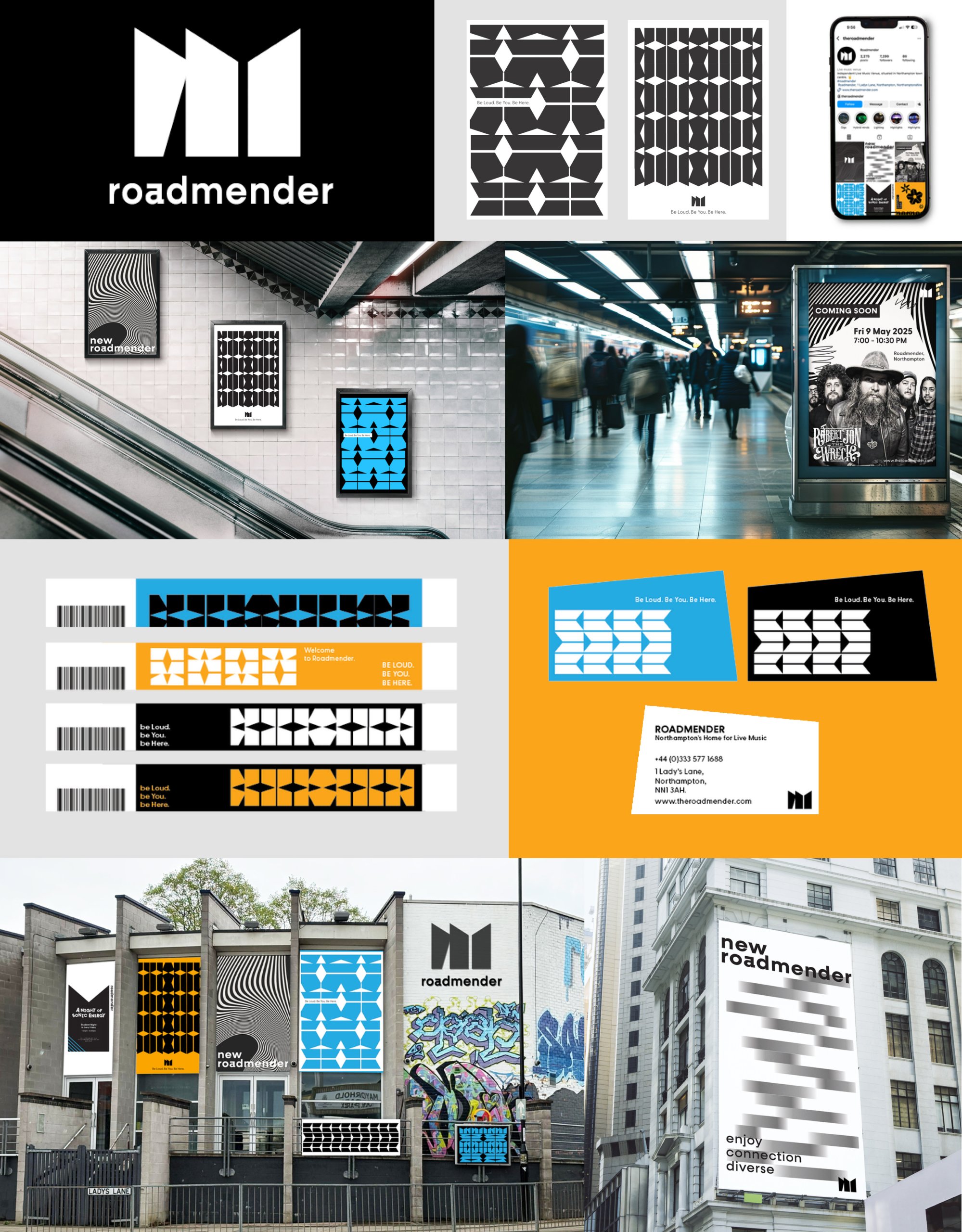 The rebranded Roadmender logo draws inspiration from the building’s architectural front view, capturing the brand’s distinctive character and long-standing legacy. Its design uniquely reflects Roadmender’s identity, showcasing both its personality and specialized focus in the creative and cultural scene. An additional motif pattern design uses lines, circles, and irregular shapes of the logo to create a dynamic, memorable visual that reflects the brand’s creativity and uniqueness.”